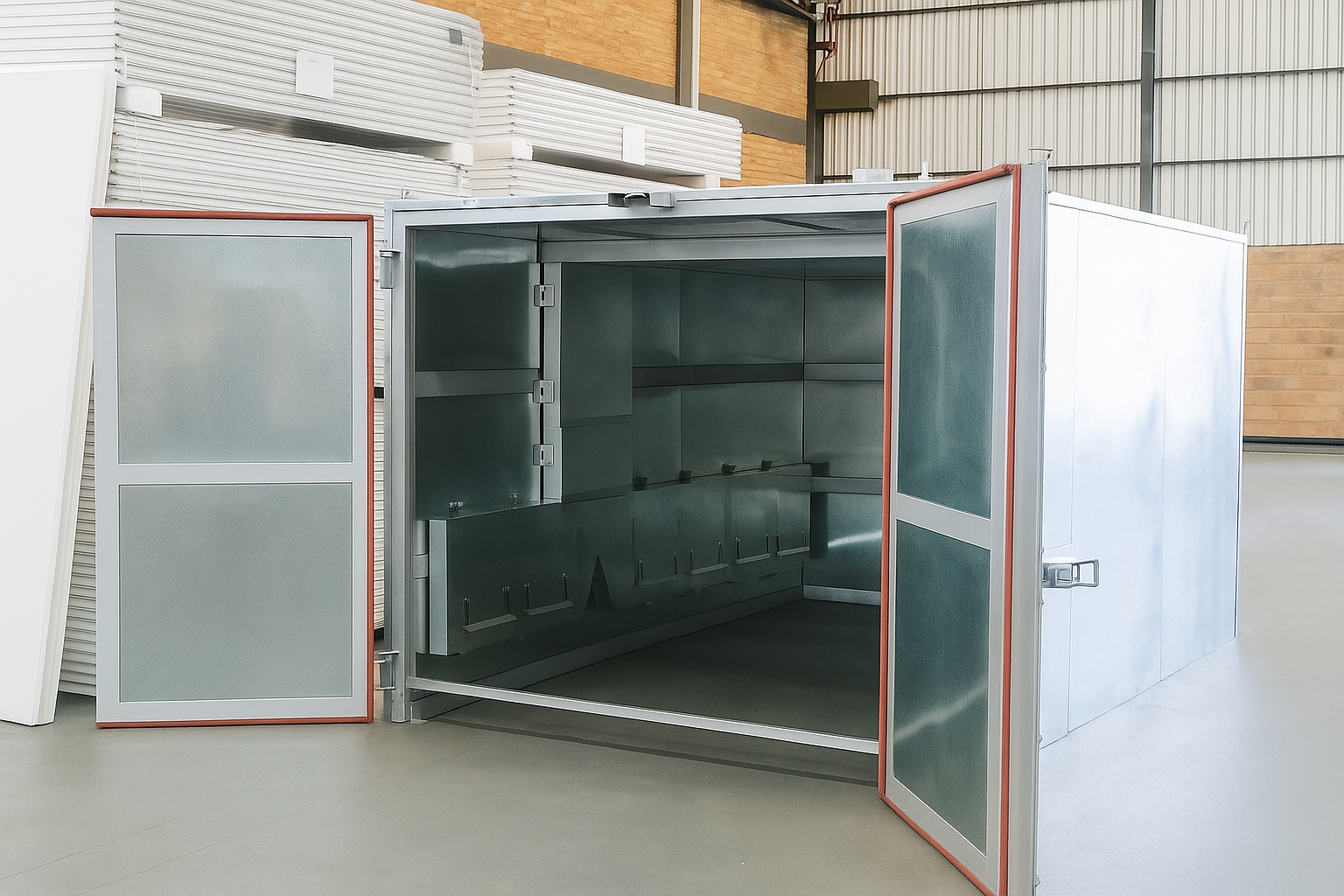 Para procesos intensivos que requieren menor tiempo de curado y mayor control térmico, el Horno de Alto Rendimiento utiliza calentamiento eléctrico o a gas, aislamiento reforzado y sensores distribuidos, asegurando la máxima precisión y eficiencia en el curado de la pintura.