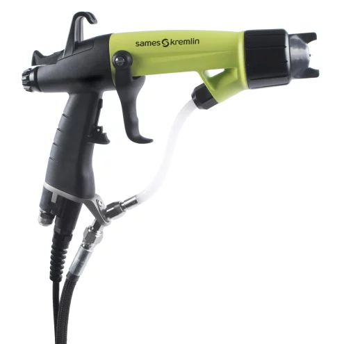 Pistola de pintura electrostática Sames Nanogun Airspray, GNM, que incluye conjunto de manguera de aire y producto, cable de alimentación, cable de conexión a tierra, cubierta protectora de la pistola, kit de agujas de limpieza, boquilla de aplicación, kit de herramientas y manual del usuario.